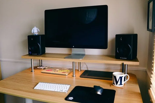 The desk is well built and sturdy. The legs are reassuringly heavy and the mechanism feels an industrial level of quality. On the desktop I have a Thunderbolt display, a set of M-Audio AV-40s, and all the usual peripherals and I’m still way under the 70kg maximum load, I can’t hear the motors struggle at all.