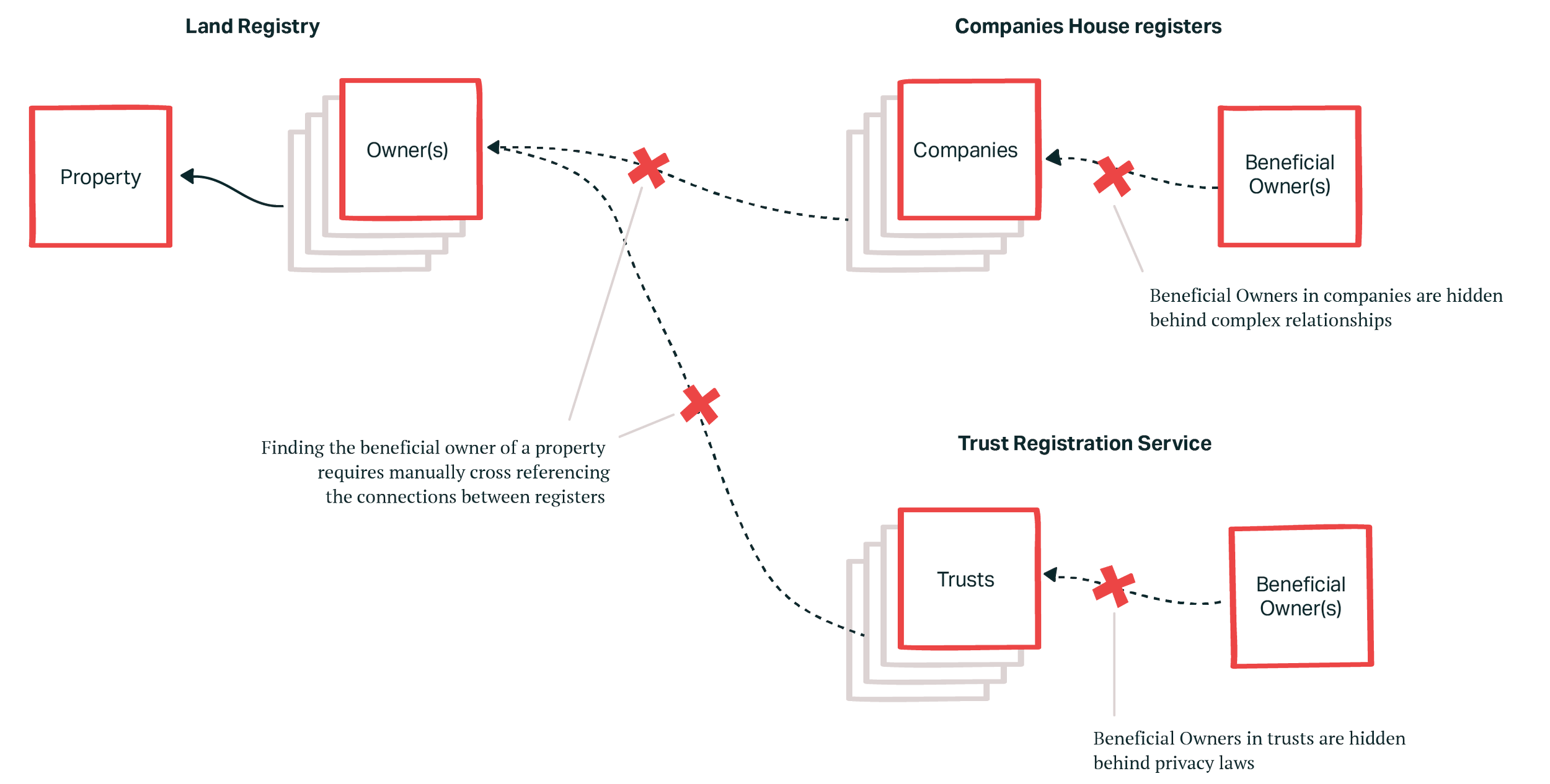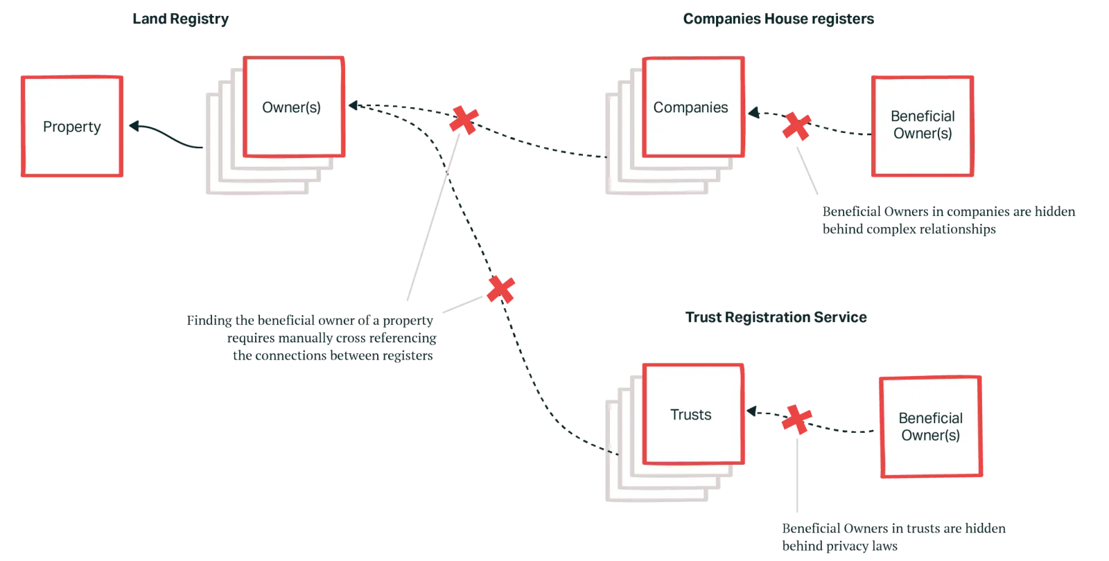 Understanding who ultimately benefits from property ownership in the UK is complex, fragmented, and opaque – even for experts. Data is spread across multiple registers, policy obligations are unclear, and responsibility is often indirect or obscured.